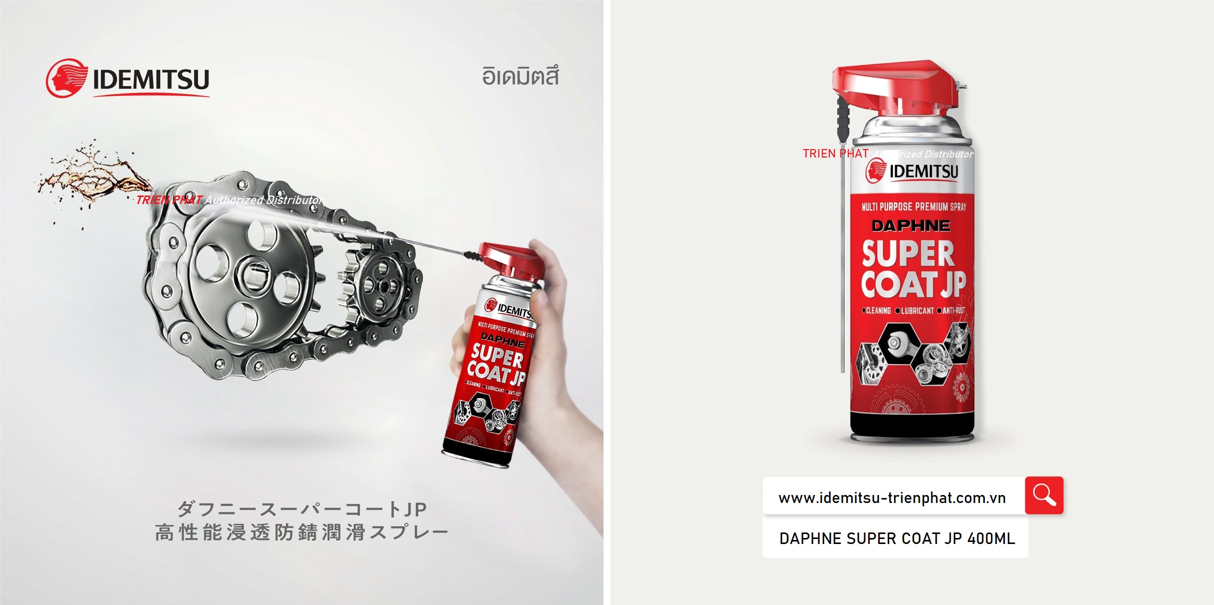 Daphne Super Coat JP là loại dầu chống rỉ dạng aerosol được pha chế đặc biệt với dầu gốc khoáng tinh chế cao và các chất phụ gia khác nhau như phụ gia chống rỉ sét và tác nhân chịu cực áp molypden hữu cơ, những chất này cải thiện khả năng thẩm thấu, chống gỉ và bôi trơn. Do tiềm ẩn tác động đến môi trường, nên phụ gia ăn mòn không chứa hợp chất bari.