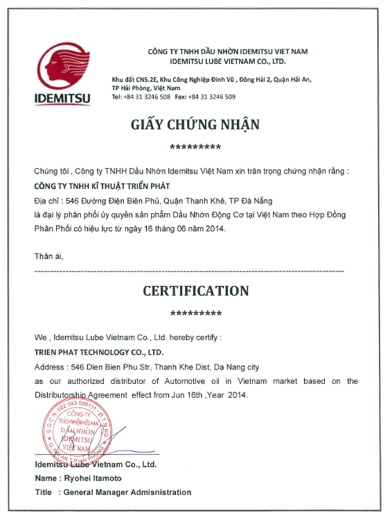 Tháng 6 năm 2014, Công ty TNHH Kỹ Thuật TRIỂN PHÁT được Công ty Dầu Nhờn IDEMITSU lựa chọn là đối tác chiến lược; phân phối sản phẩm dầu nhờn mang thương hiệu IDEMITSU và OEM do IDEMITSU sản xuất.